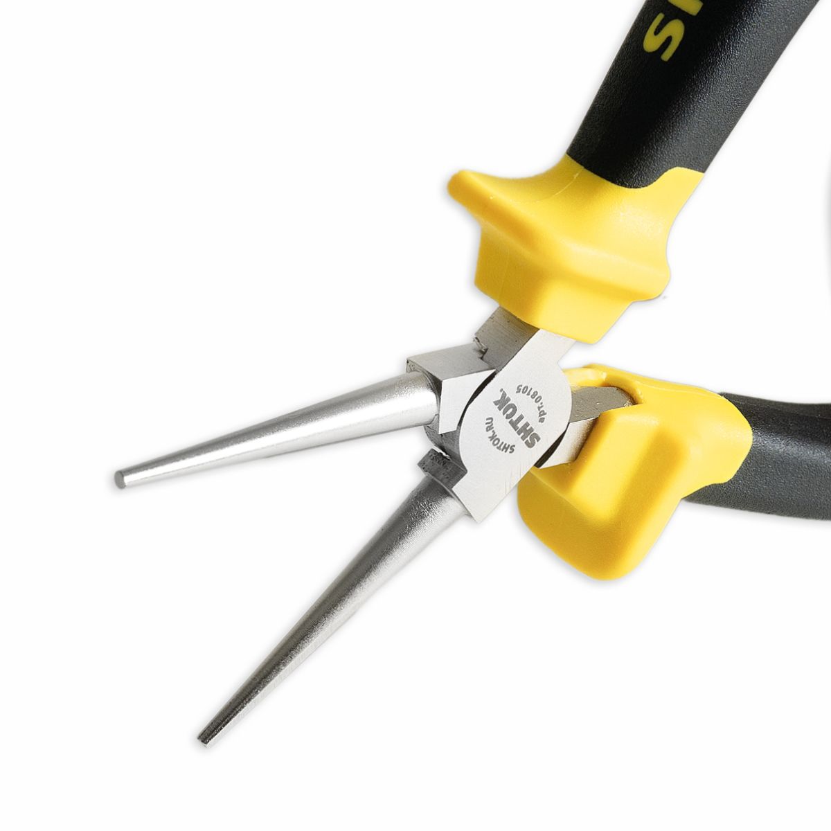 Диэлектрические круглогубцы SHTOK 1000В 160 мм 08105 - инструмент, предназначенный для выполнения различных работ под напряжением. Рукоятки круглогубцев выполнены из двухкомпонентного пластика и оснащены упорами, препятствующими соскальзыванию руки во время работы.
