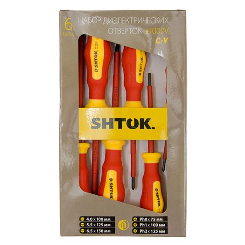 Набор диэлектрических отверток SHTOK 6 шт. картон 1000В 09906 состоит из диэлектрических отверток (три шлицевых и три крестовых). Рабочая часть отверток выполнена из хром-ванадиевой стали, оснащена магнитным наконечником для удобства монтажа в приборах, расположенных вертикально. Набор поставляется в картонной упаковке.