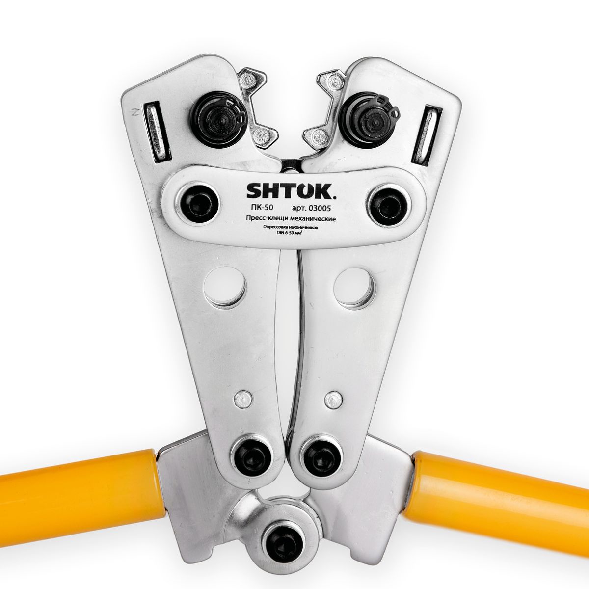Ручные пресс-клещи SHTOK ПК-50 03005 производят опрессовку одним движением. Легко перенастраиваются на любое сечение. Прочная конструкция обеспечивает надежность и долговечность конструкции. Сечения: 6, 10, 16, 25, 35, 50 мм2.