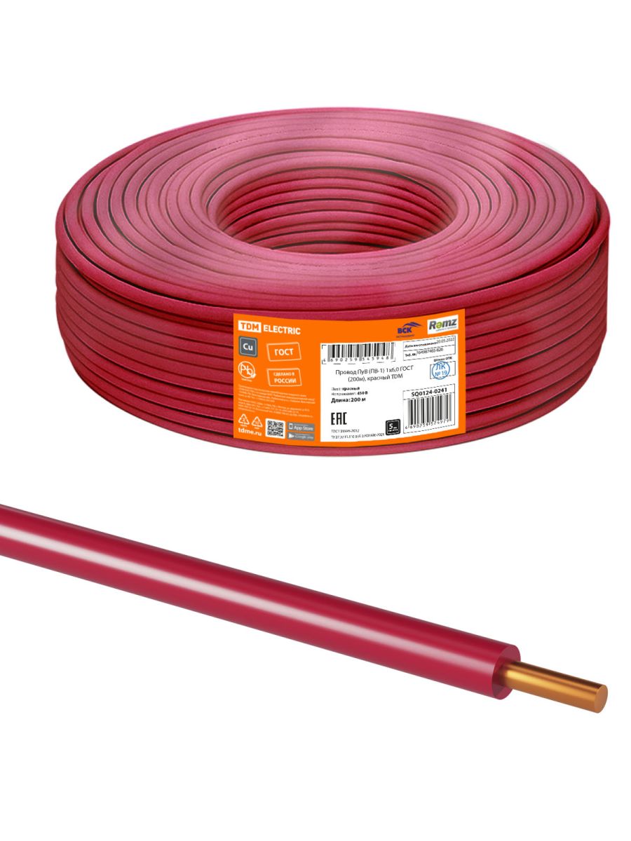 Провод ПуВ (ПВ-1) 1х6,0 ГОСТ (200м), красный TDM