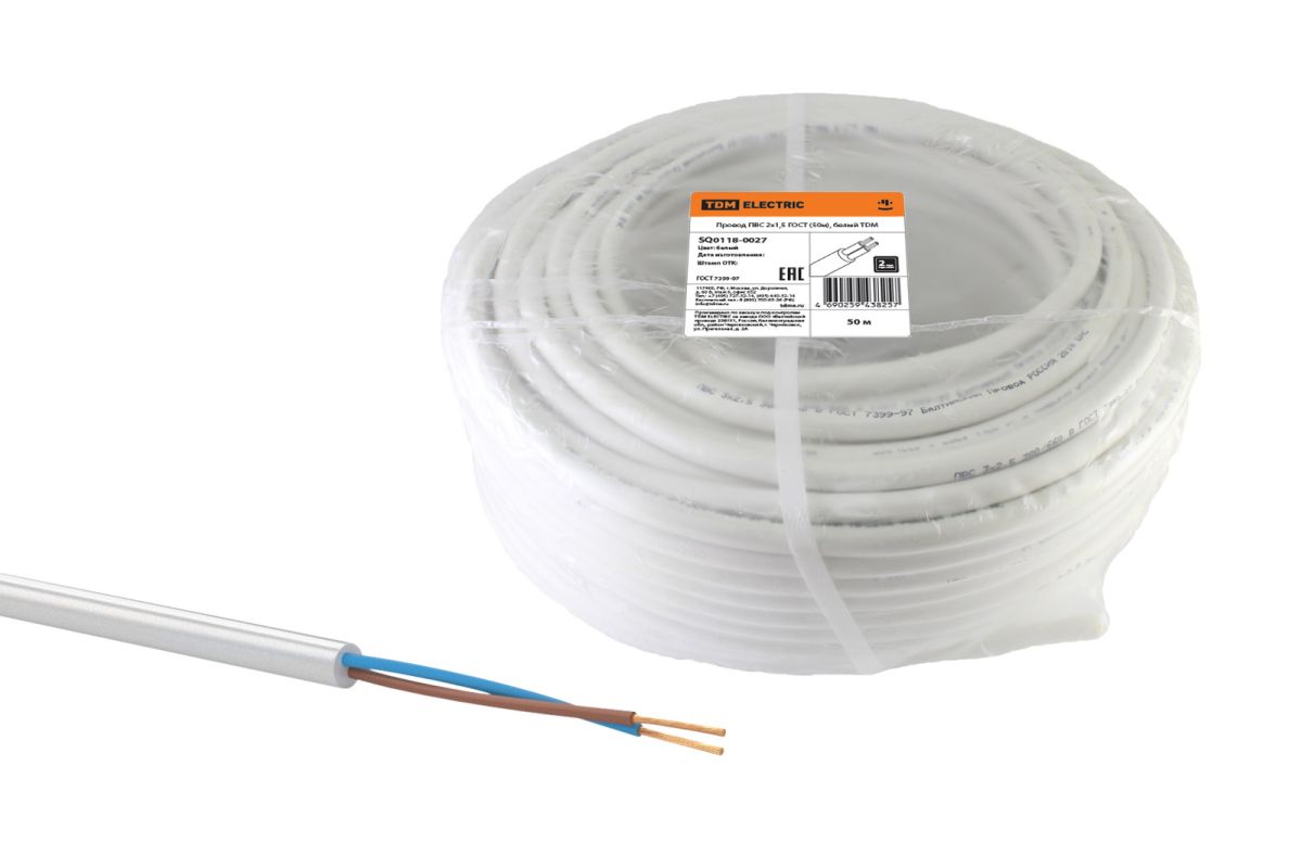 Читать все статьиПровод ПВС 2х1,5 ГОСТ (50м), белый TDM
